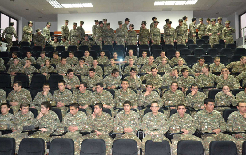 Մինչև ֆիլմի ցուցադրումը համալսարանի գրադարանին նվիրաբերվեց Հայաստանի ազգային կինոկենտրոնի և «Հոգևոր Հայաստան» մշակութային հասարակական կազմակերպության կողմից պատրաստած և հրատարակած «Նրանք նկարում էին պատերազմը» գիրք - տարեգությունը, որտեղ զետեղված են Արցախյան պատերազմը ճակատի առաջին գծում վավերագրած 34 հեռուստա և կինոօպերատորները։ 34՝ երկու հրացանով զինվորները (այդպես են կոչում պատերազմ նկարող օպերատորներին) իրենց կյանքը վտանգելով սերունդների համար կերտել են Արցախյան գոյամարտի տարեգրությունը։ Գիրքը նվիրված է Հայոց բանակի կազմավորման 25-ամյակին։ Կուրսանտների և սպայական կազմի համար ներկայացվեց նաև գրքի երկու խտասկավառակների նյութը՝ 4,5 րոպեանոց հոլովակով։