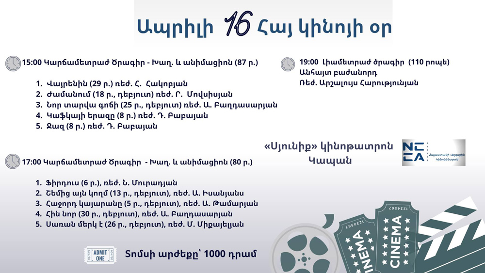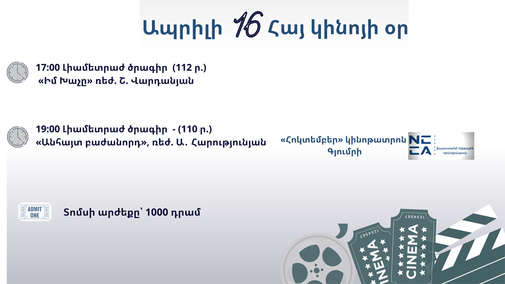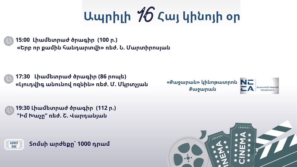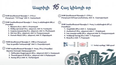 Միայն մեկ օր՝ ապրիլի 16-ին, բոլոր կինոթատրոնները ցուցադրելու են հայկական հին ու նոր բազմաժանր ֆիլմեր՝ նշանավորելով Հայ կինոյի ծնունդը։